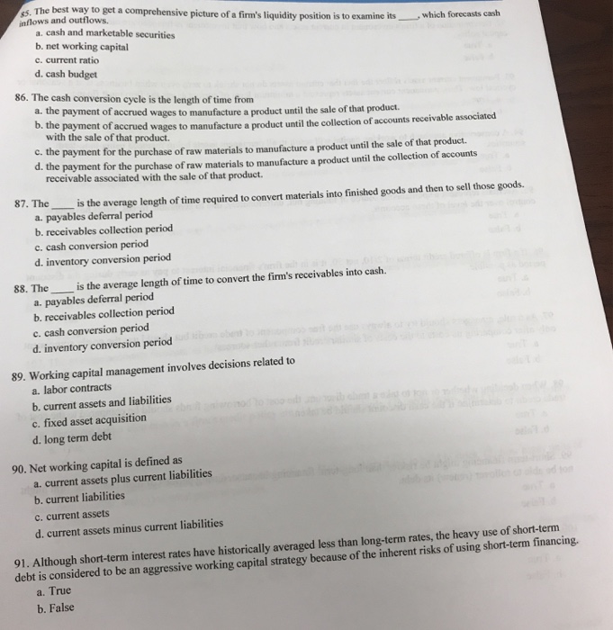 Cash and short-term assets expected to be converted to cash within a year less short-term liabilities. School Kennesaw State University. Study with Quizlet and memorize flashcards containing terms like Which one of the following is the financial statement that shows the accounting value of a firms equity as of a particular.
